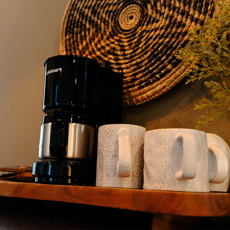 The ensuite bathroom includes a spacious glass-door shower, fresh linens, and organic EO bath products for a spa-like experience. Though compact, the unit is intelligently laid out with practical touches like shelving and hooks to enhance your stay.