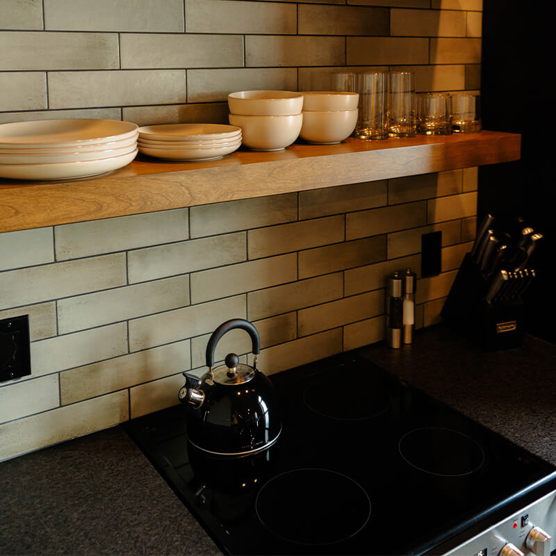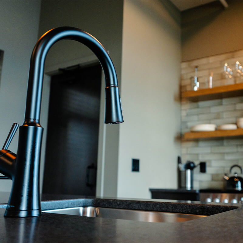 The kitchen, with local Mesabi black granite counters, is appointed with the guest traveler in mind. A bar counter and three stools provide a view of the lake for relaxing mornings sipping coffee before the day begins and a gathering area at the end of the day for a cocktail and dinner. The efficient kitchen is completely equipped with new stainless-steel appliances and single-sink and open shelving for cookware and utensils. There is nothing you’ll be missing to make your stay comfortable. Leave those tools at home!