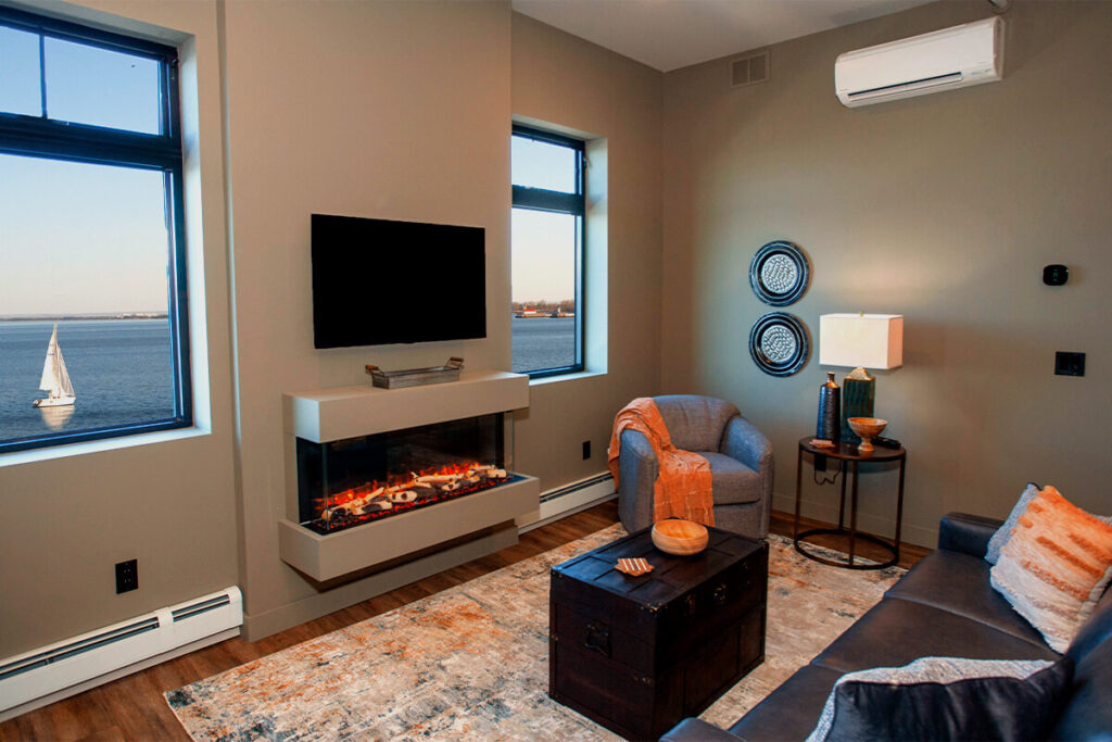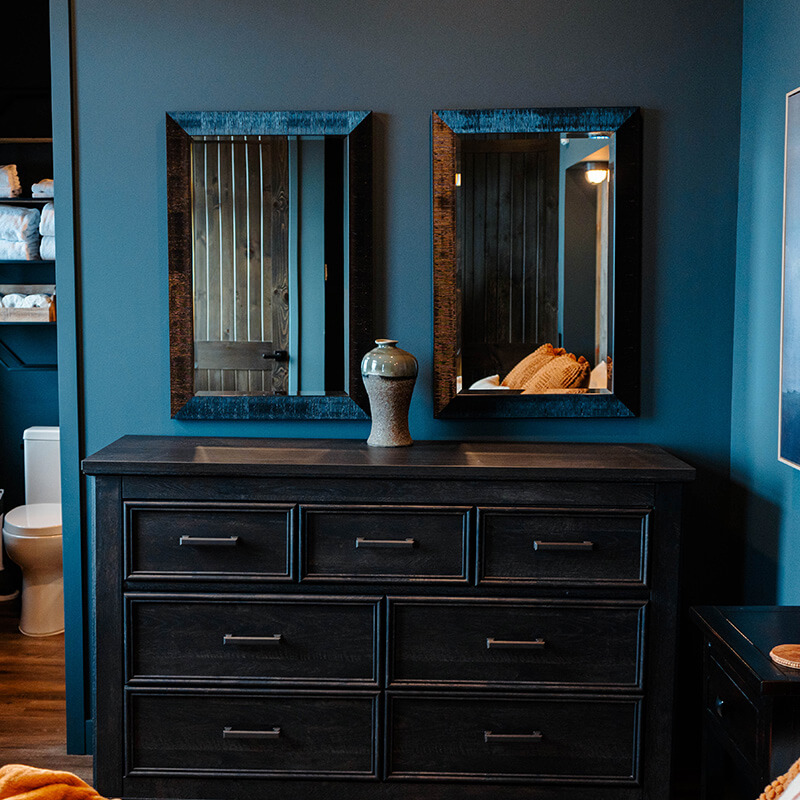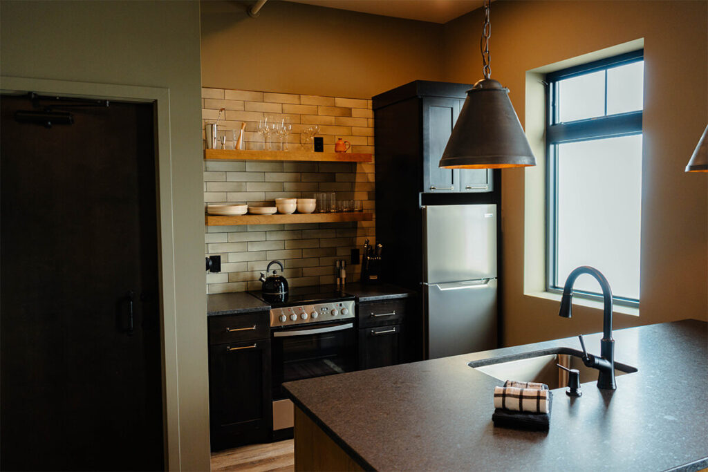 The 700-square-foot unit comprises of a quaint kitchenette and intimate living space with full views of Lake Superior as well as a statement electric fireplace. The spacious bedroom with double dresser and hooks also offers large views of the world’s largest freshwater lake. Reclaimed wood headboard –