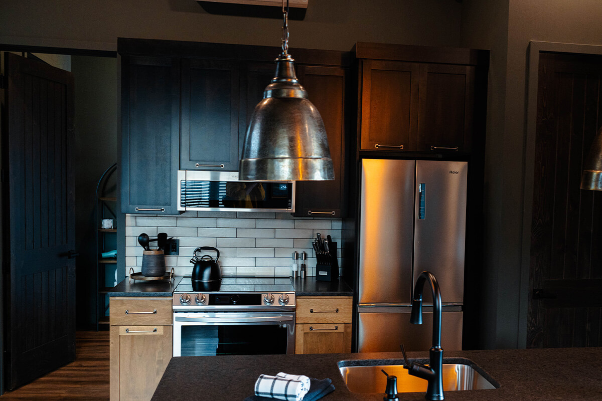 The open kitchen, with local Mesabi black granite, is fully appointed with the guest traveler in mind. A bar counter and three stools and nearby dining table set with four chairs provide views of the lake for relaxing mornings sipping coffee before the day begins and a gathering area at the end of the day for a cocktail, dinner and games. The efficient kitchen is completely equipped with new stainless-steel appliances and single-sink and cookware and utensils. There is nothing you’ll be missing to make your stay comfortable. Leave those tools at home with our Thor unit!